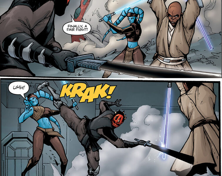 8) Despite having help from Aayla Secura & ObiWan Kenobi he's unable to gain any notable advantage over the zabrak Sith "Darth Maul"Count Dooku", another Jedi also supported windu, even though he had vaapad, shatterpoint and 3 Jedi assisting him windu could not prevent his team from being on the recieving end & a member died even though Windu crossed blades with both opponents.
